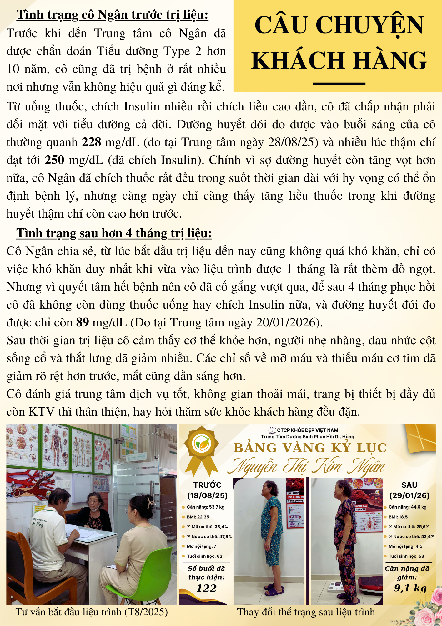 Quan trọng là trao đổi lại với khách hàng về mức độ tuân thủ các hướng dẫn đã đưa ra trước đó, bao gồm chế độ ăn uống, tập luyện và sinh hoạt. Trung tâm sẽ cùng khách hàng rà soát những điểm chưa thực hiện tốt, phân tích nguyên nhân và đưa ra giải pháp điều chỉnh phù hợp, dễ áp dụng hơn để đảm bảo hiệu quả lâu dài.